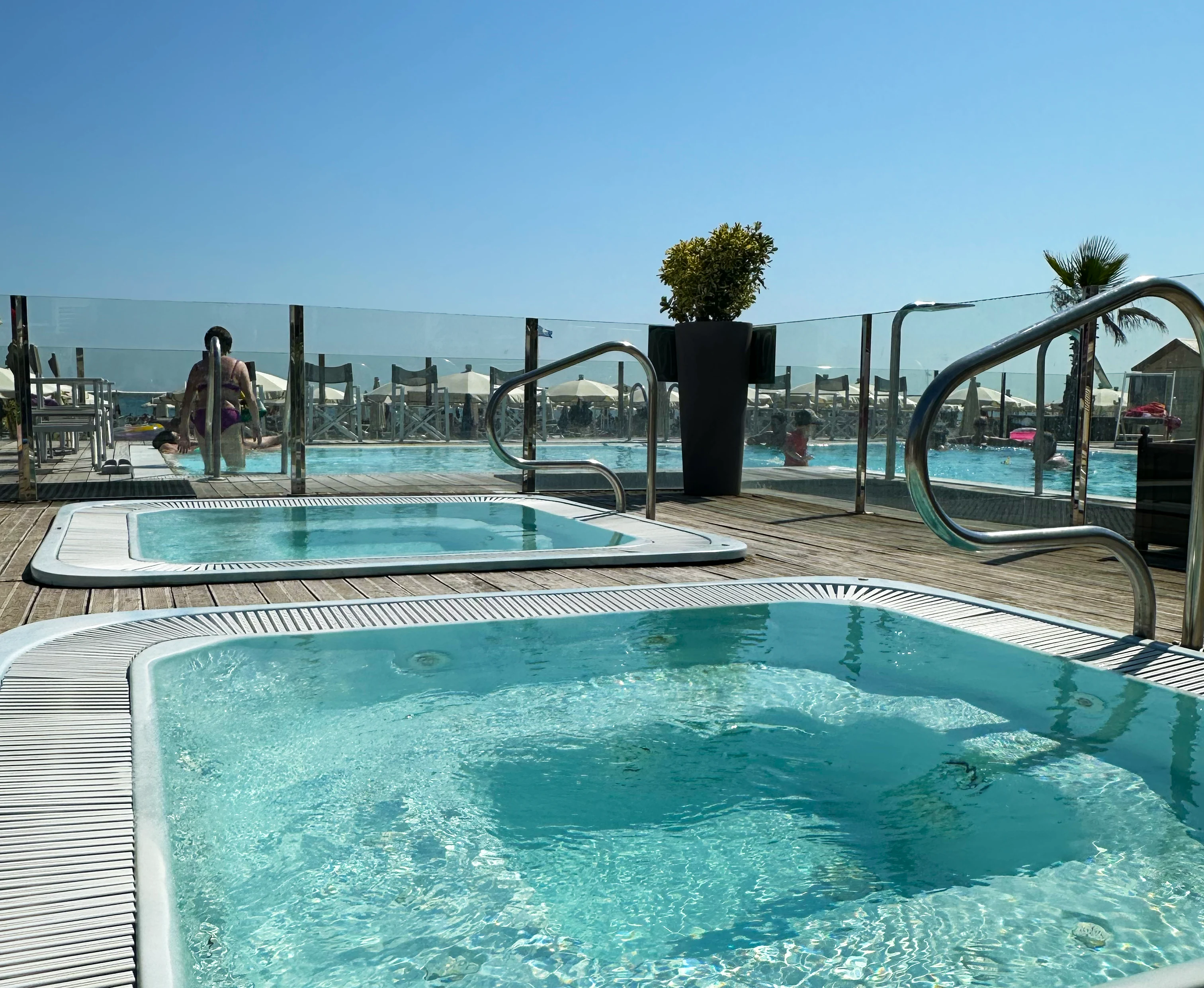 Due piscine ad altezze diverse: 60cm e 120cm, ideali per bambini e due vasche idromassaggio.
